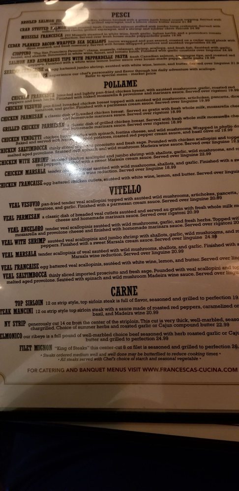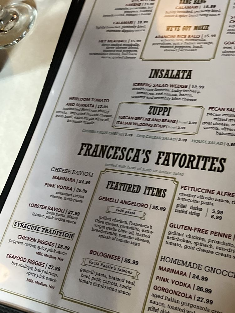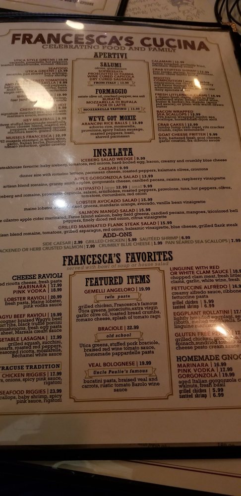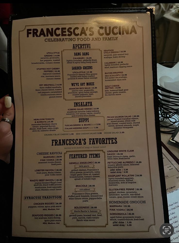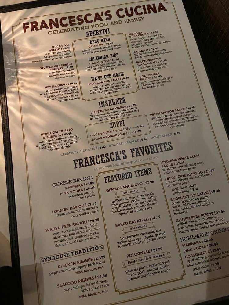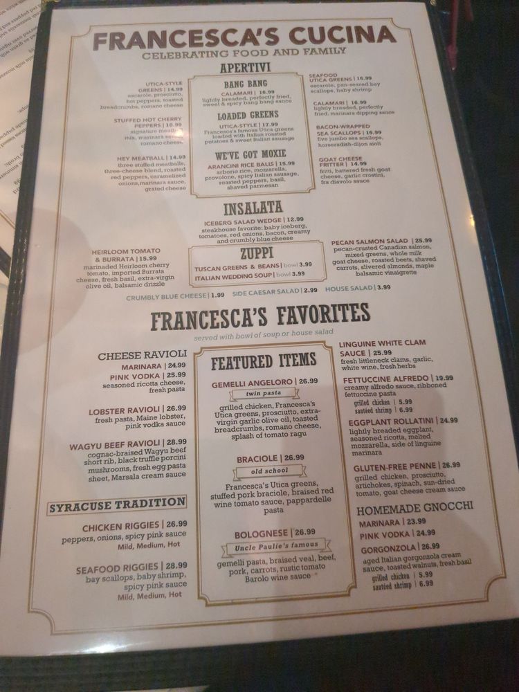Francesca's Cucina is a popular Italian restaurant in Syracuse, NY, known for its upscale yet casual atmosphere. With a diverse menu offering vegan and vegetarian options, this restaurant caters to a variety of preferences. Customers rave about the Seafood Utica Greens and the Hey Meatball, showcasing the unique and flavorful dishes served here. The Apple Gorgonzola Salad and the Italian Wedding Soup are also beloved by diners. Make sure to make a reservation in advance, as this restaurant tends to be bustling with guests. Overall, Francesca's Cucina is a must-visit for Italian cuisine lovers looking for a classy dining experience with delicious food options.
